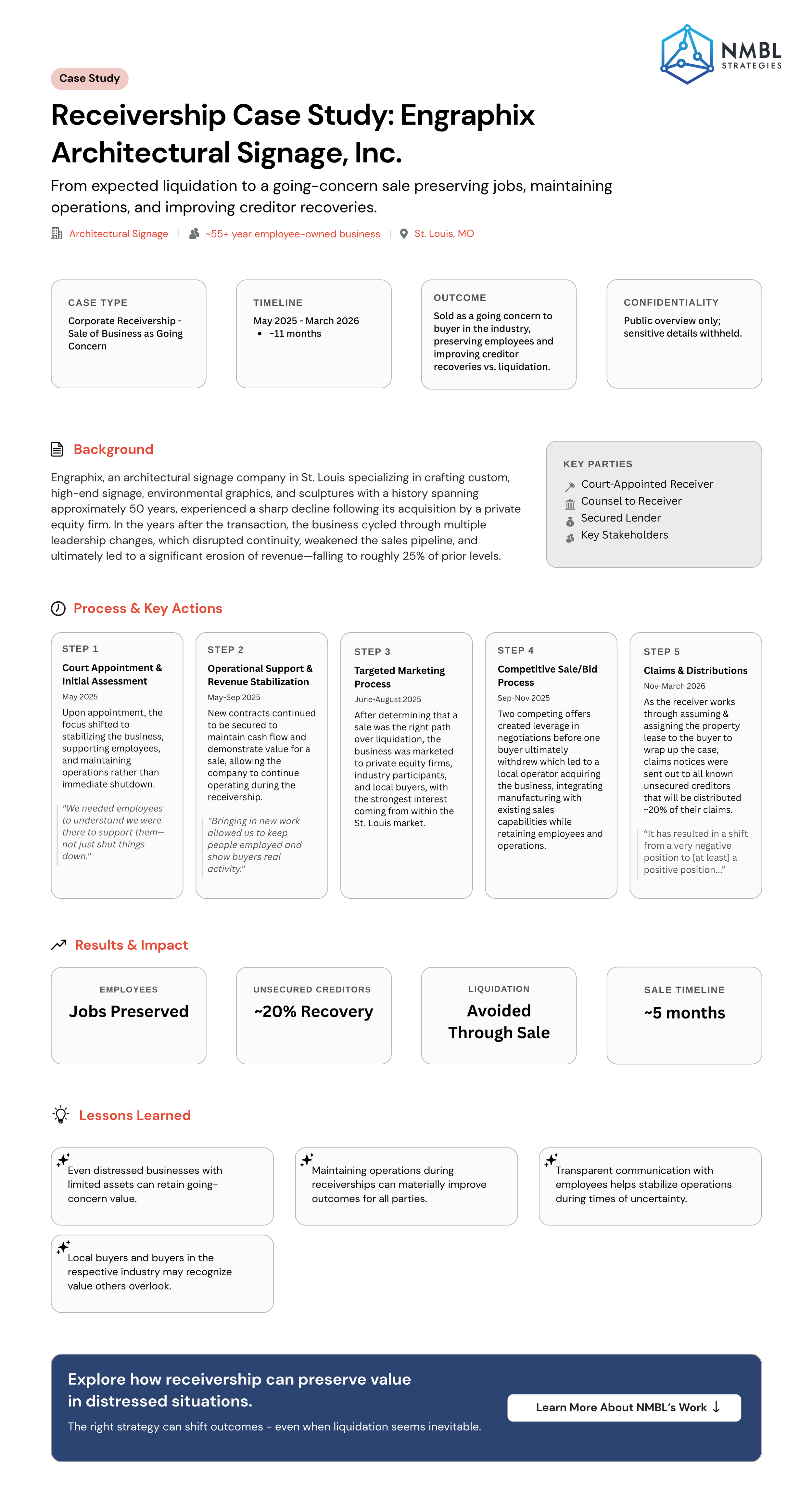NMBL Strategies was engaged as the court appointed receiver by the St. Louis County Courts over Engraphix Architectural Signage. NMBL has pulled together a marketing and sales plan for the business that will allow for this 55+ year old company to return to business through new ownership.